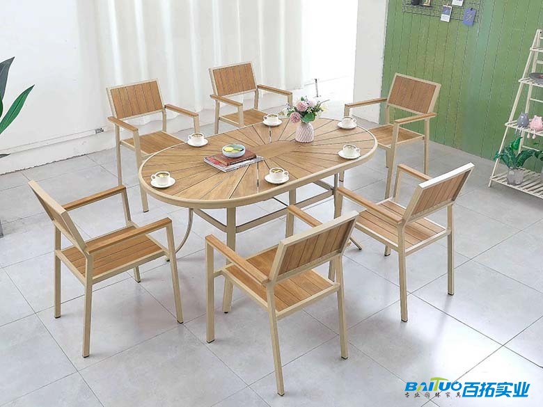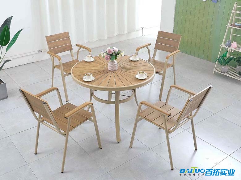 仿木材质逼真的木纹效果,为桌椅赋予了自然质朴的美感。其丰富的颜色和纹理选择,能够适配各种户外风格,从简约现代到田园复古,都能完美融入。搭配铝合金支架的金属质感,更增添了一份时尚与精致,使桌椅组合成为户外空间的一道亮丽风景线。