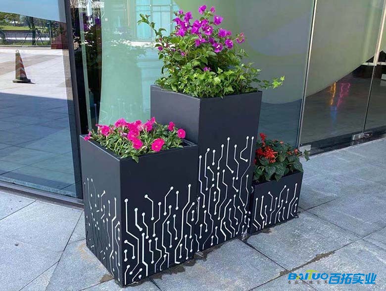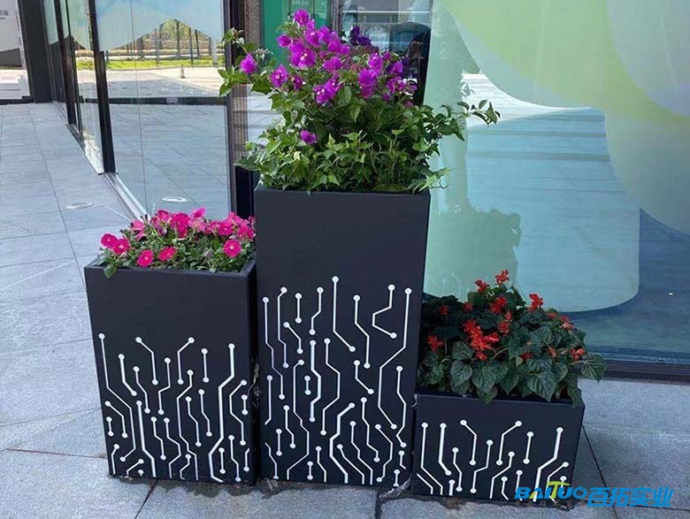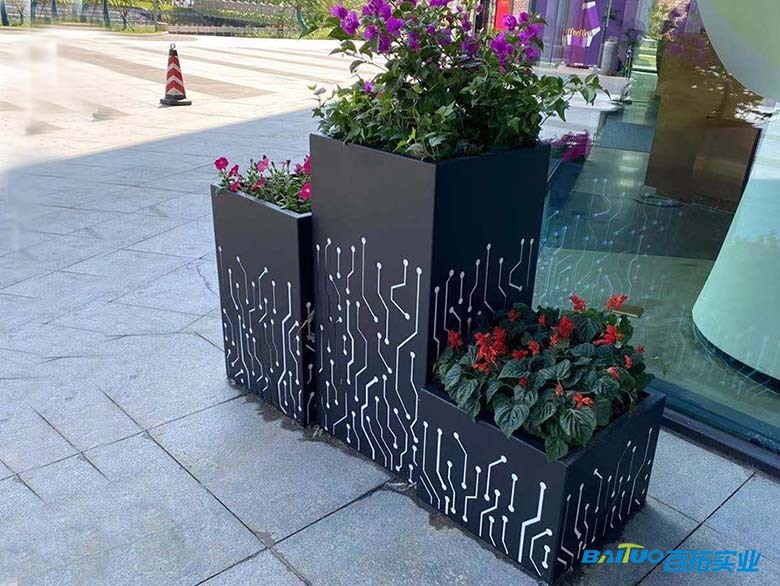 在电子市场客户的项目中,百拓园林家具推出了线路图镂空铁艺花箱,将电子元素与景观设计完美融合。花箱表面以精密的激光切割工艺,复刻复杂的电路板线路图案,每一条“线路”、每一个“焊点”都栩栩如生。白天这些镂空的线路图与箱内的绿植相互映衬,形成科技与自然碰撞的独特视觉效果,仿佛绿色生物从线路板中生长出来,吸引往来行人驻足观赏;夜晚花箱内置的LED灯带亮起,如同电流在虚拟空间中穿梭,为电子市场注入灵动的科技氛围。无论是作为市场入口的标志性景观,还是分布在各商铺门前作为装饰分隔,线路图镂空花箱都能精准契合电子市场的科技主题,成为吸引客流、提升市场辨识度的创意亮点。